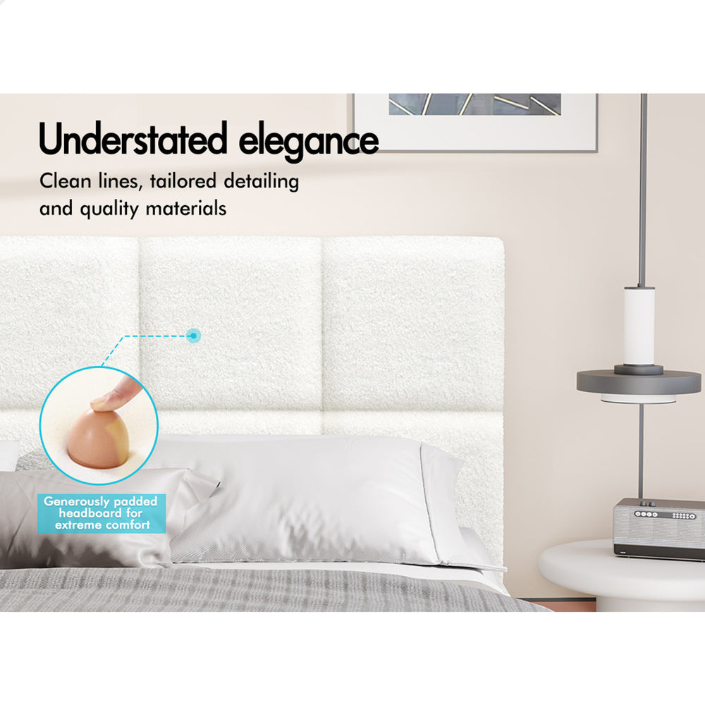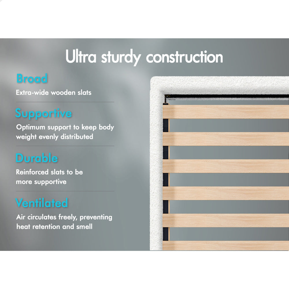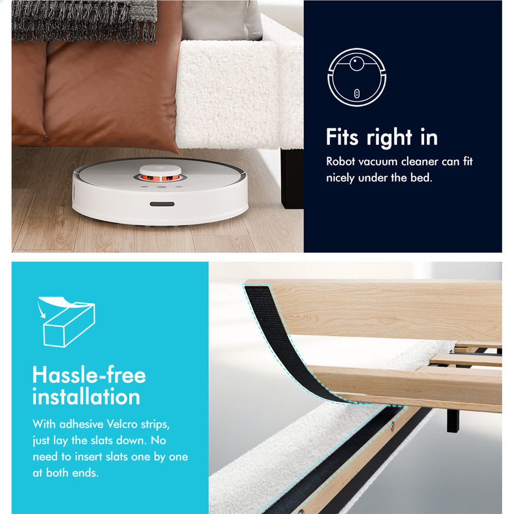 Elevate your bedroom with the Cassandra Boucle Bed Frame — a perfect blend of comfort, style, and smart design. Upholstered in textured boucle fabric, it features a padded headboard, embedded mattress support to prevent sliding, and extra-wide slats for enhanced durability. The elevated frame promotes airflow and allows robot vacuums to pass through with ease, while a reinforced X-support structure ensures reliable strength. Assembly is a breeze thanks to Velcro-backed slats.