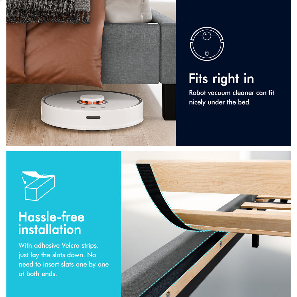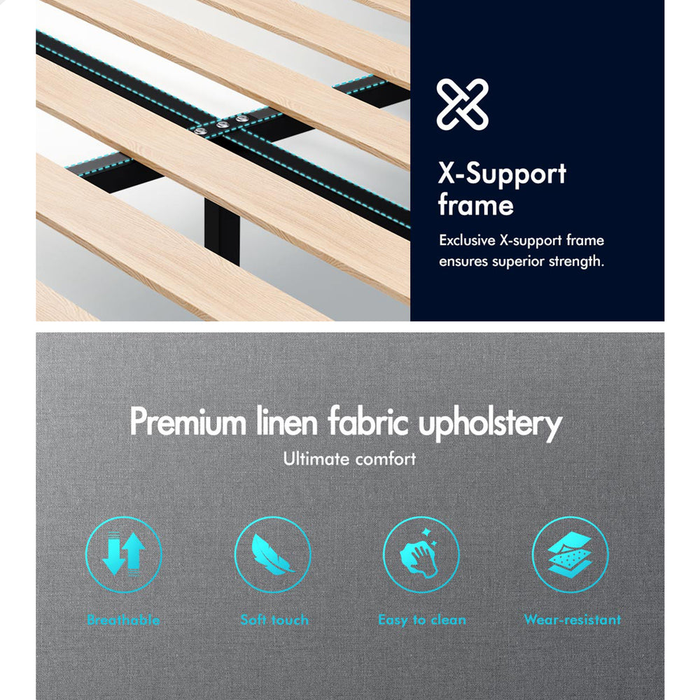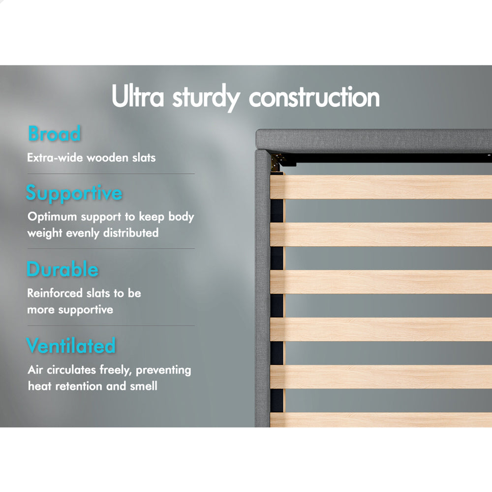 The Cassandra Upholstered Bed Frame in Grey is where modern design meets practical comfort. Upholstered in soft, durable fabric with a plush padded headboard, it features an embedded base to prevent mattress movement, Velcro-backed slats for easy setup, and reinforced support for durability. The elevated design allows airflow and extra under-bed storage, making it both stylish and functional.