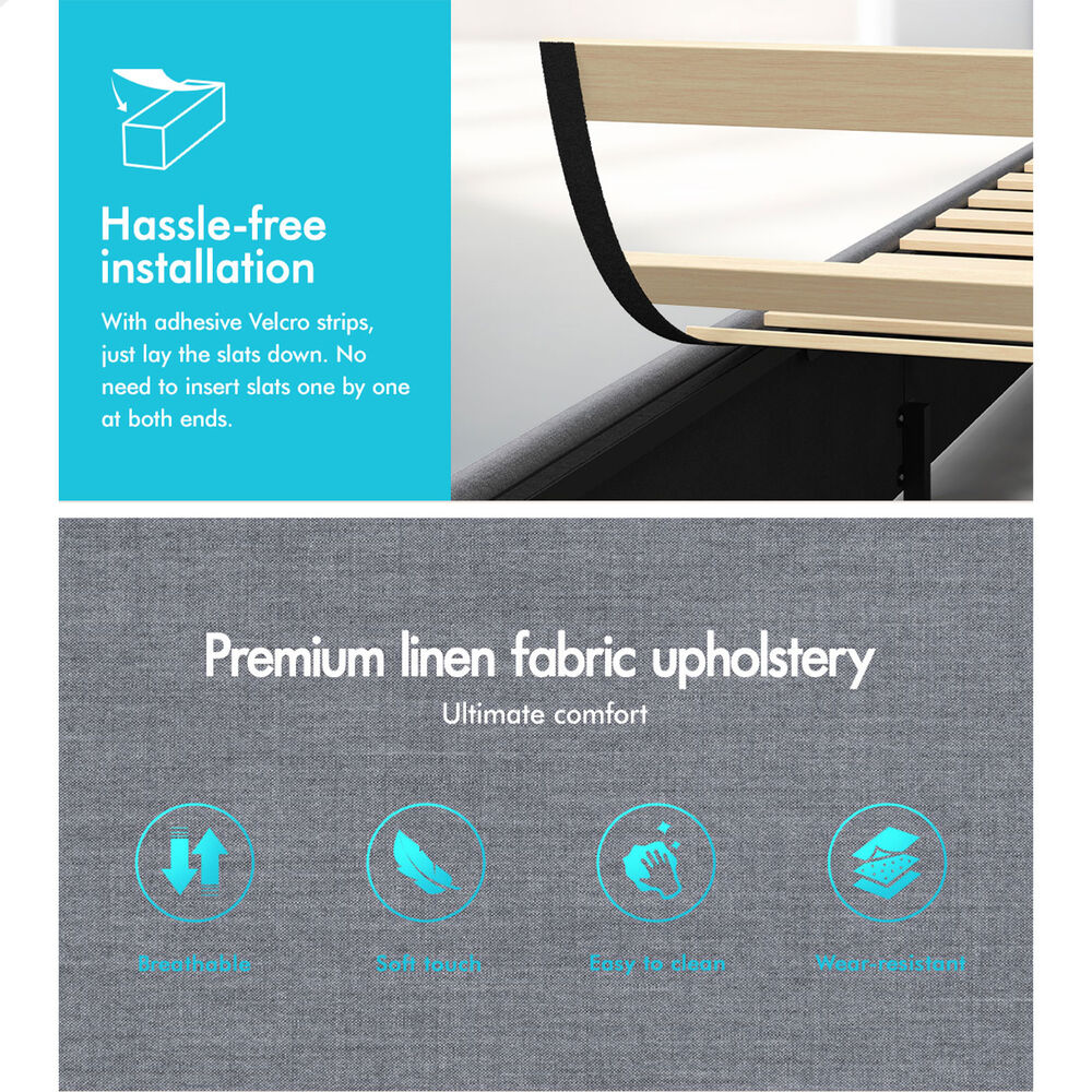 Maximise your bedroom’s storage and comfort with the Caledon Upholstered Gas Lift Bed in Grey. Upholstered in fabric and crafted with durable materials, it features generous under-bed storage, a customisable LED headboard, reinforced slats with Velcro strips for easy setup, and a classic padded design that adds comfort and style to your space.