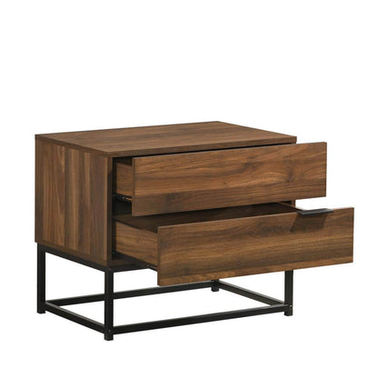 Add bold, contemporary style to your space with the Cody Bedside Table. Featuring rich walnut woodgrain tones and a striking black metal frame, this piece combines modern design with everyday practicality. Two spacious drawers with smooth metal runners offer convenient storage for your nighttime essentials. Finished in 3D paper lamination with powder-coated black metal legs for a sleek, durable look.
