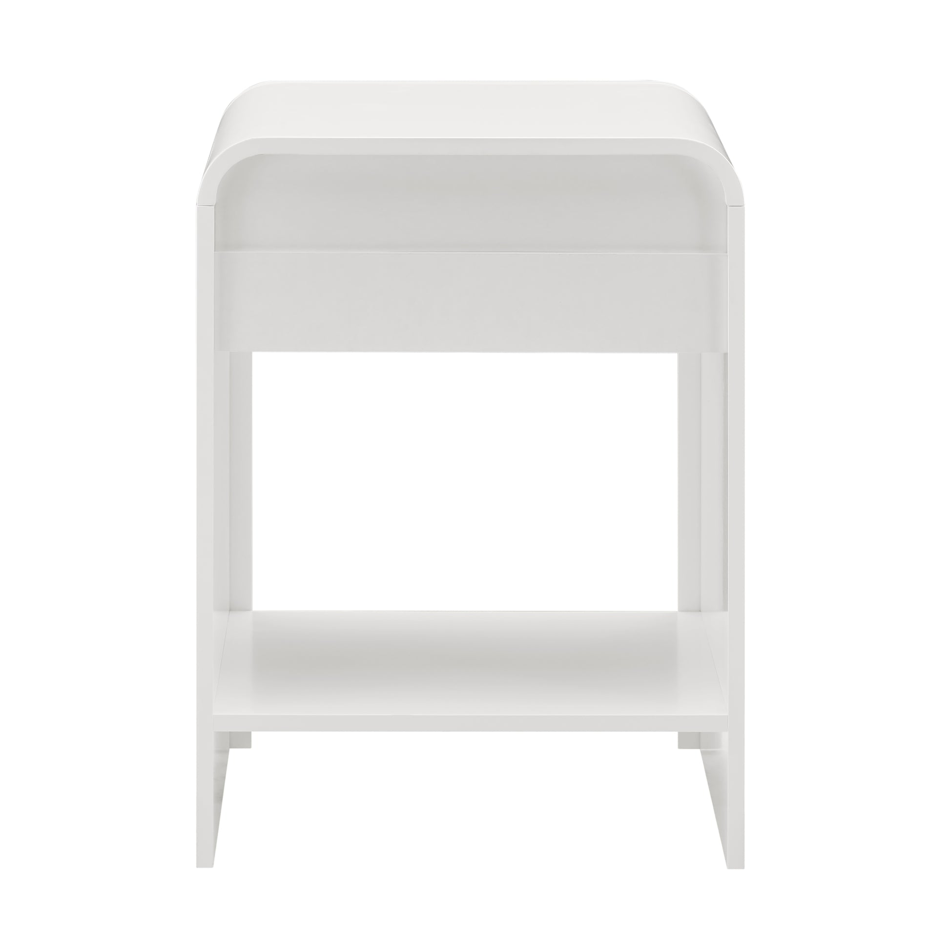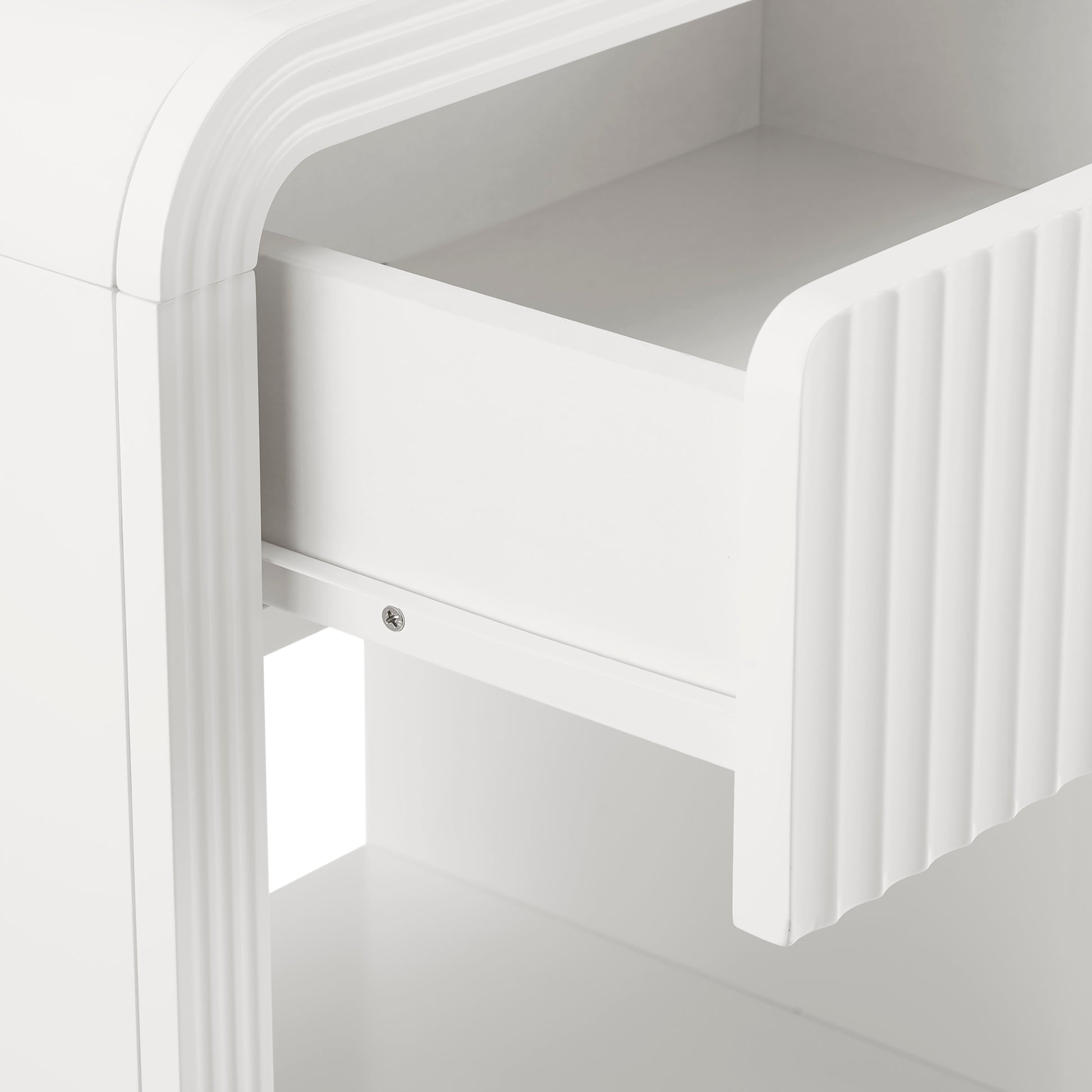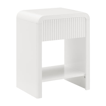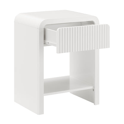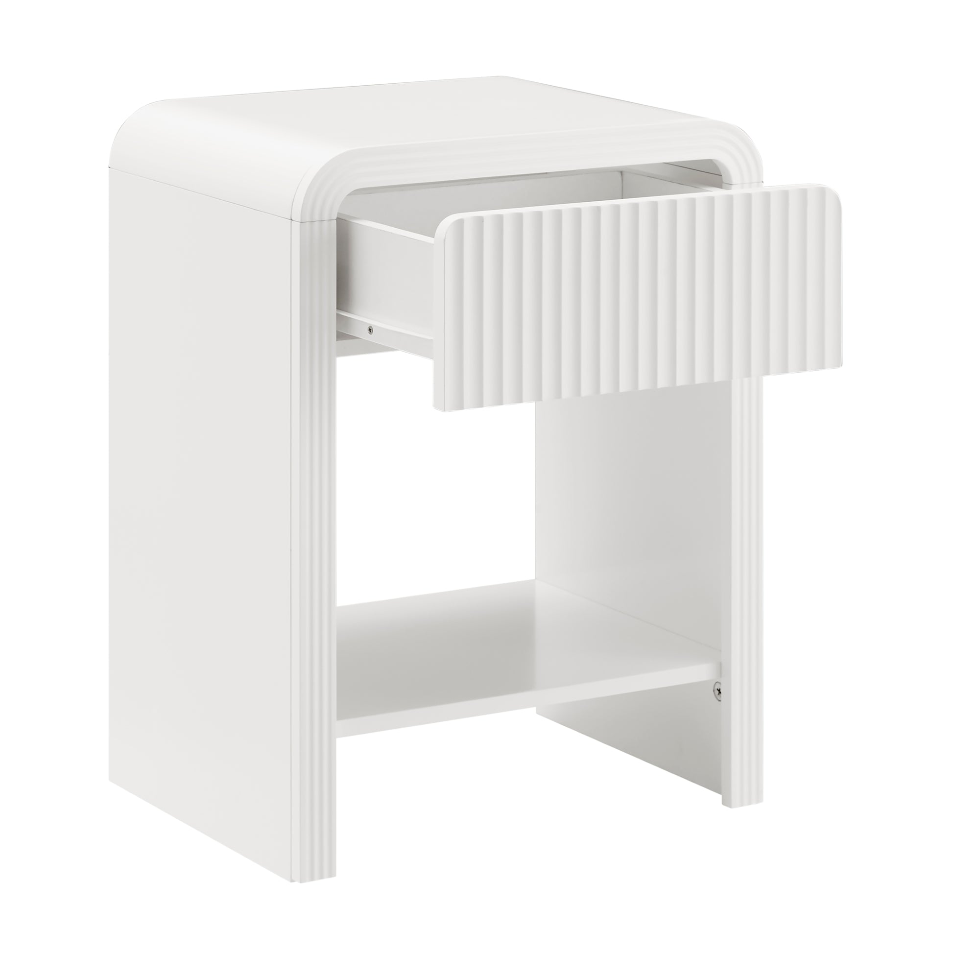 Elevate your bedroom or living space with the Mireille 1 Drawer Bedside Table featuring a smooth curved design, elegant rippled drawer front, and a spacious pull-out drawer for practical storage. Made from durable painted MDF, this timeless side table adds a touch of sophistication to any modern or classic interior. Perfect for storing essentials while enhancing your décor with its clean and stylish finish.