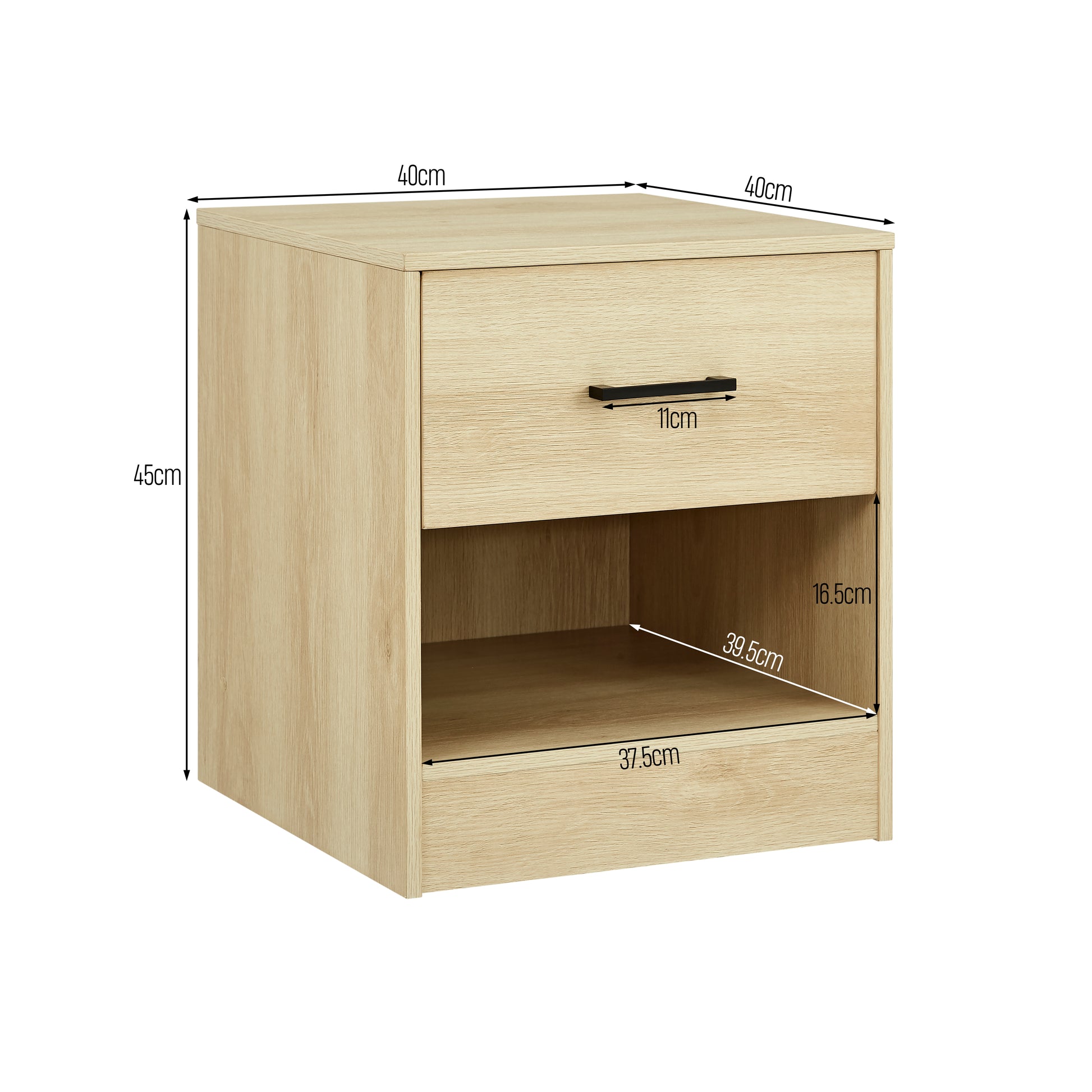 Add modern style and functionality to your home with the Griffin 1 Drawer Bedside Table in oak. Featuring a smooth metal runner drawer and open shelf storage, this versatile table is perfect for bedrooms, living rooms, or offices. Crafted from durable laminated particleboard with a natural oak finish, it offers an elegant and practical solution for organising your essentials.