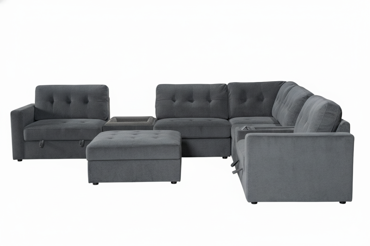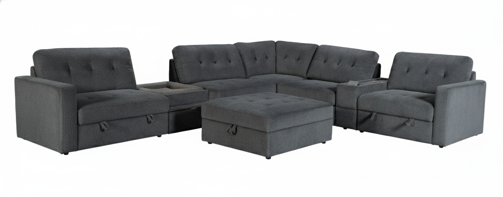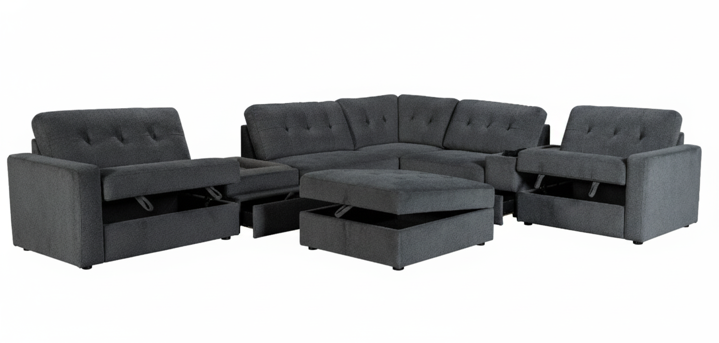 | Set Inclusions | 1 x Corner, 1 x 1-Seat LAF Arm with Storage, 1 x 1-Seat RAF Arm with Storage, 2 x 1-Seat No Arm, 1 x Console with Pet Bed and Storage, 1 x Console with Wireless Charger and Storage, 1 x Ottoman with Storage |