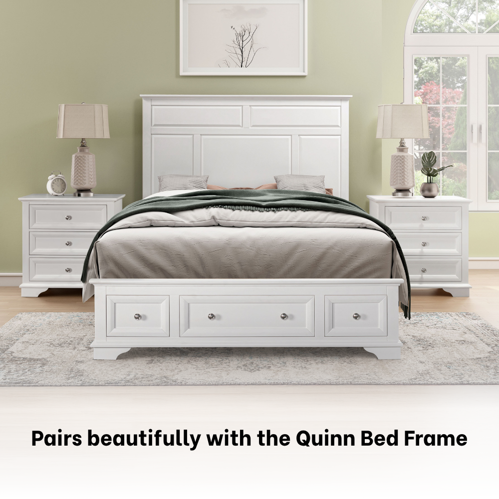 Bring modern elegance to your bedroom decor with the Quinn 3-Drawer Bedside Table. With its provincial-style legs and charming button-draw handles, this sophisticated piece will make any space look instantly more chic. Make a statement with this timeless 3-drawer wonder!