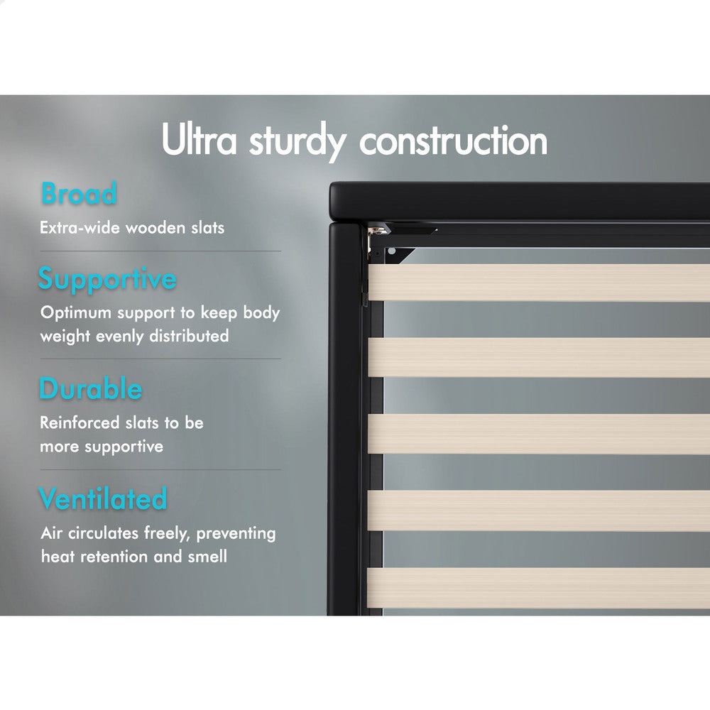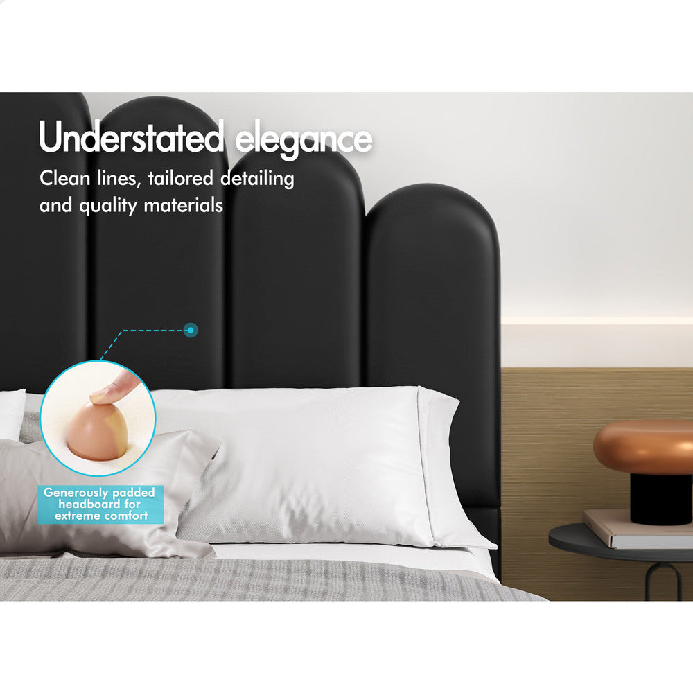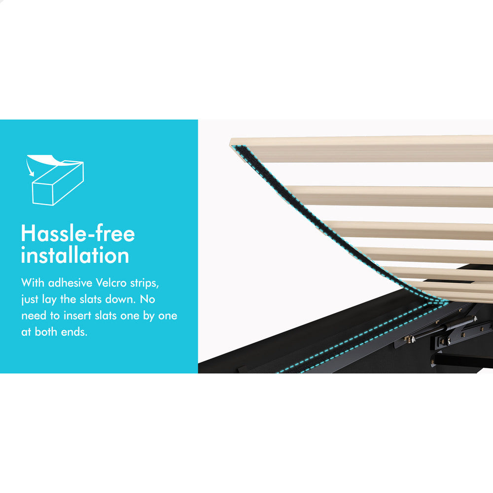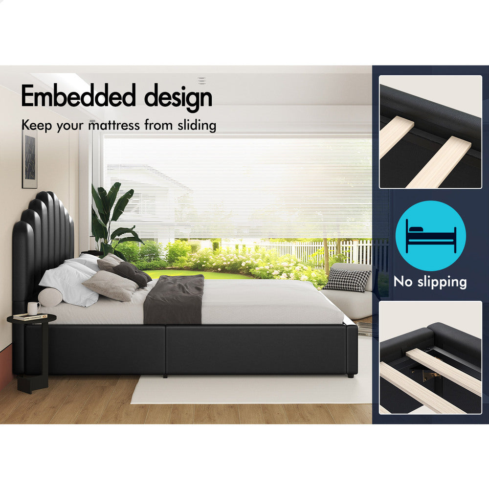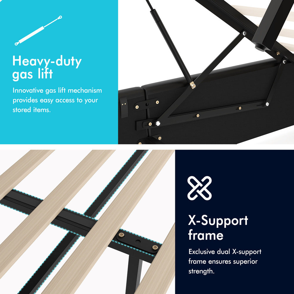 Sleek and practical, the Roswell in black faux leather delivers modern style with smart storage. Its gas-lift mechanism offers effortless access to spacious under-bed storage, while the padded headboard and embedded base provide comfort and support. Built with a reinforced frame and durable slats, it’s a contemporary statement of strength and sophistication.