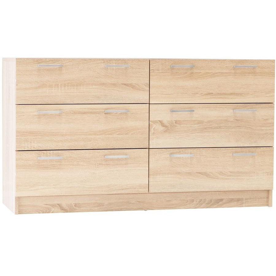The Tribecca 6 Drawer Low Boy Chest offers both style and practicality with its sleek silver accents and scratch-resistant 3D foil finish. With six spacious drawers and sturdy particle board construction, it’s perfect for storing clothes, books, or keepsakes. Includes wall anchoring for safety; assembly required.