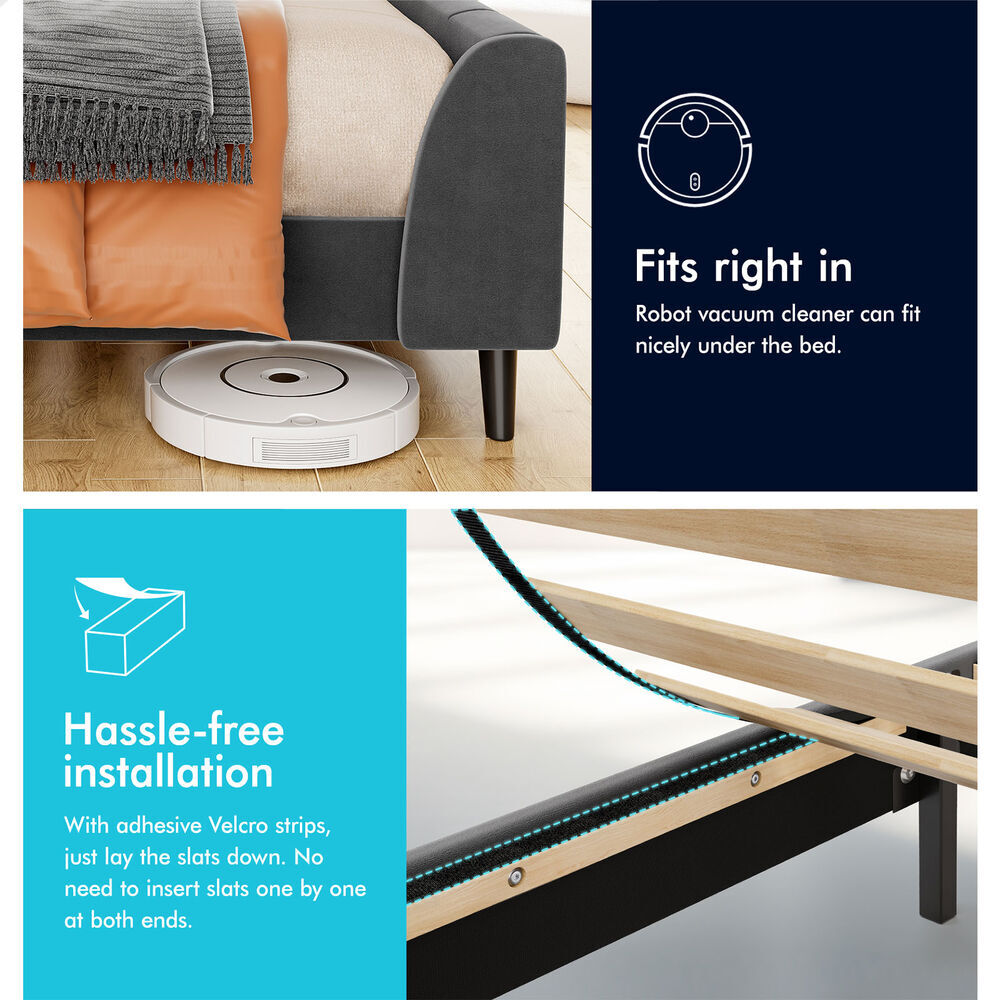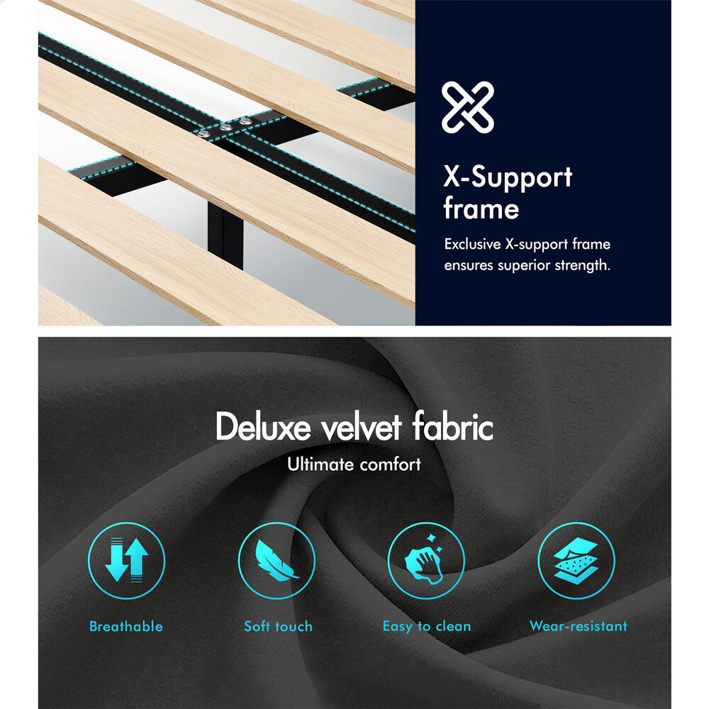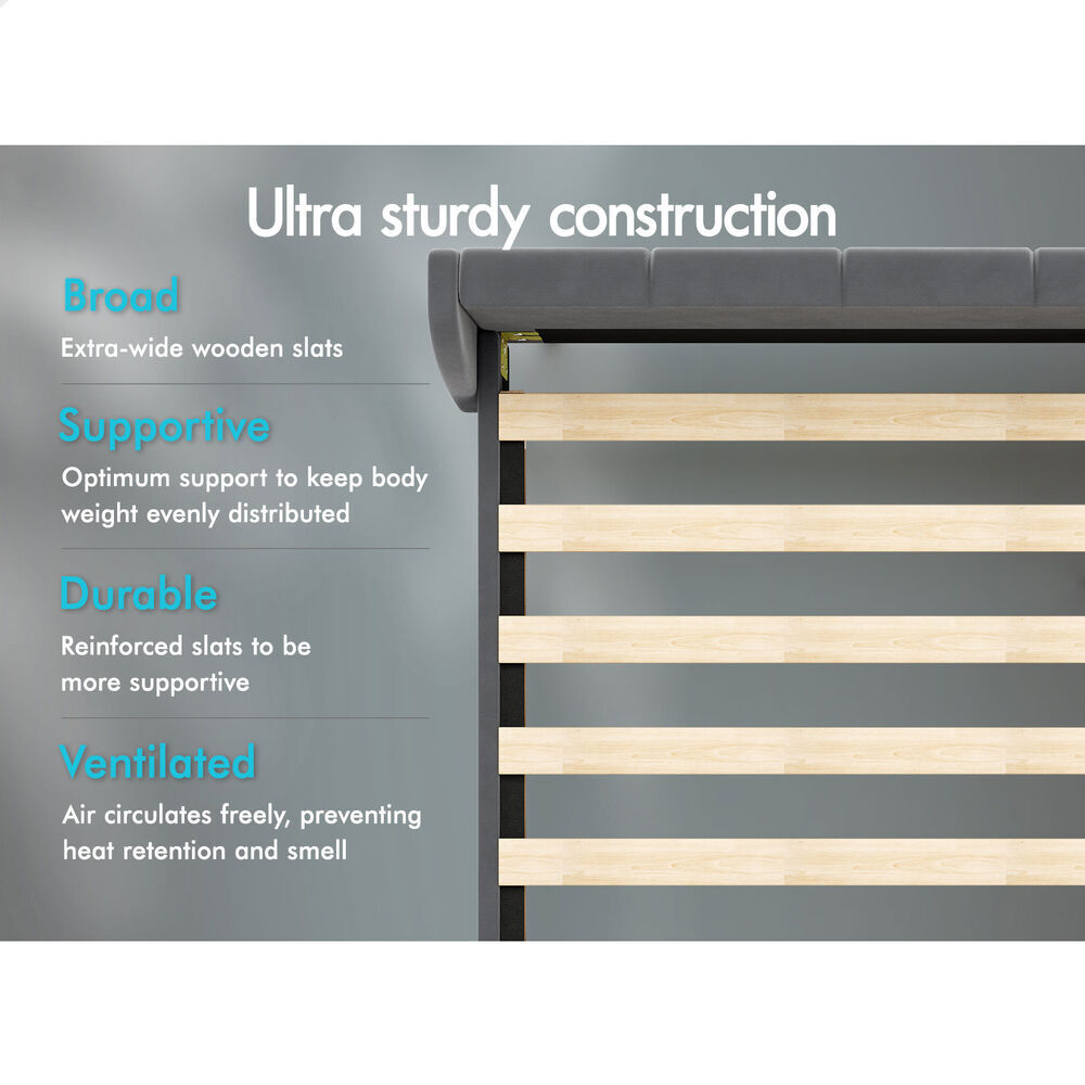 Modern and versatile, the Valencia in grey fabric offers a sleek balance of comfort and style. Designed with a horizontal-panel headboard, embedded mattress base, and reinforced X-support frame, it provides lasting strength and support. Its elevated structure promotes airflow and keeps your bedroom looking effortlessly refined.