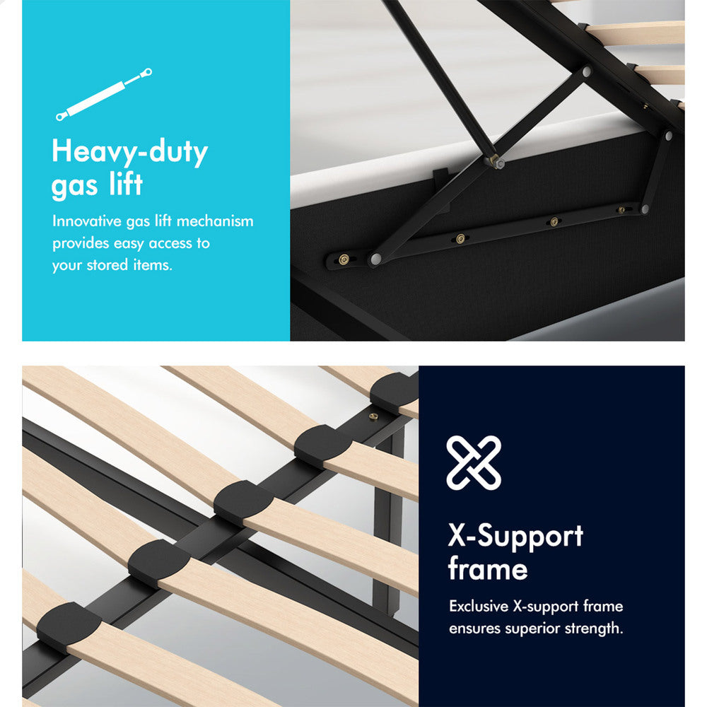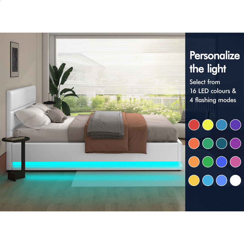 Elevate your bedroom with the White Aurora PU Leather Gas Lift Bed – a sleek and modern solution that combines luxurious style with practical storage. Upholstered in smooth PU leather, this bed features a padded headboard for added comfort, a gas-lift base for effortless access to under-bed storage, and customisable LED lighting for added ambience and safety. Built with reinforced wooden slats and a dual X-support frame, it delivers long-lasting support and a clutter-free bedroom experience.
