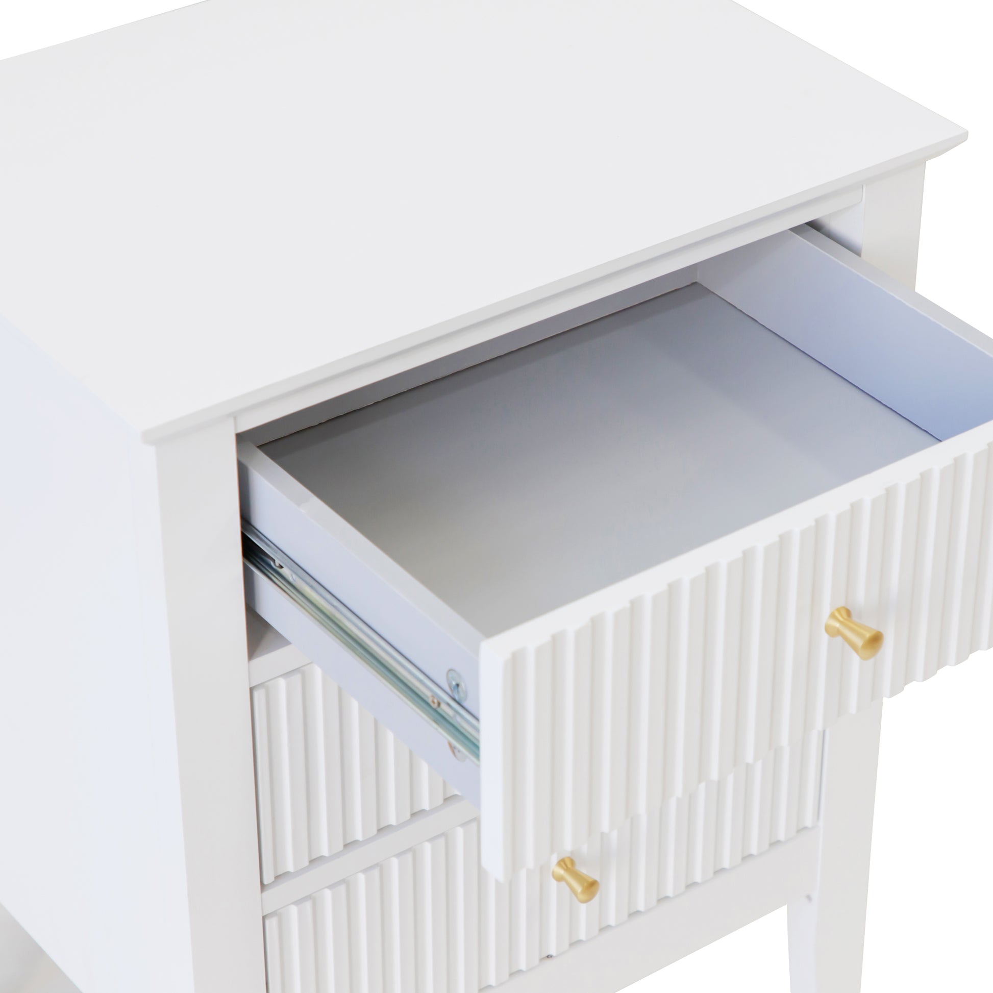 The Elegant Zara Fluted 3 drawer side table will match perfectly next to your lounge or bed. Featuring 3 spacious drawers on high quality metal slider drawer runners for storing all your personal and household items. This Side table is an everyday classic design built of high quality MDF with NC painted finish.
